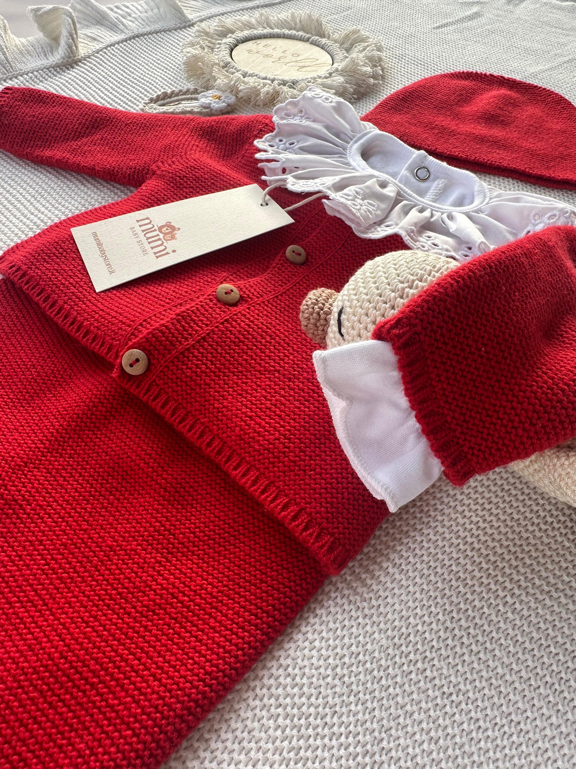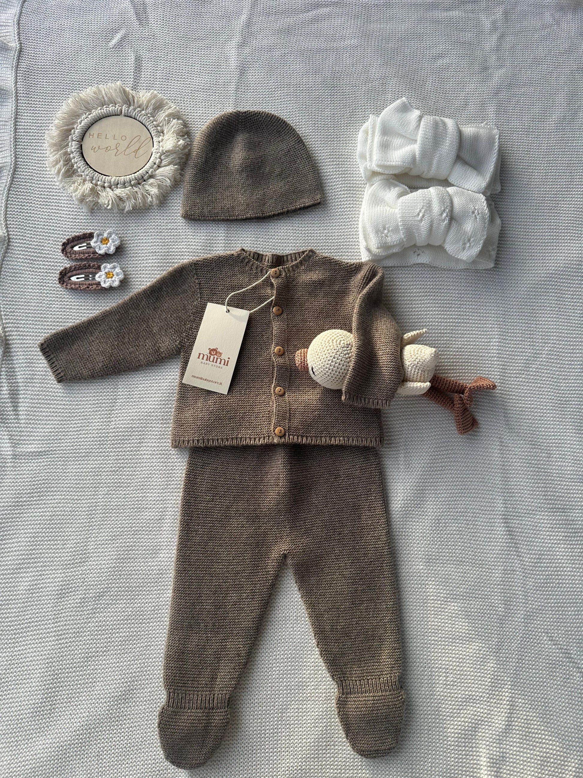 Il cardigan con bottoncini in legno, il pantalone con piedini e il cappellino coordinato creano un outfit tenero, elegante e perfetto per la stagione fredda 🤍.