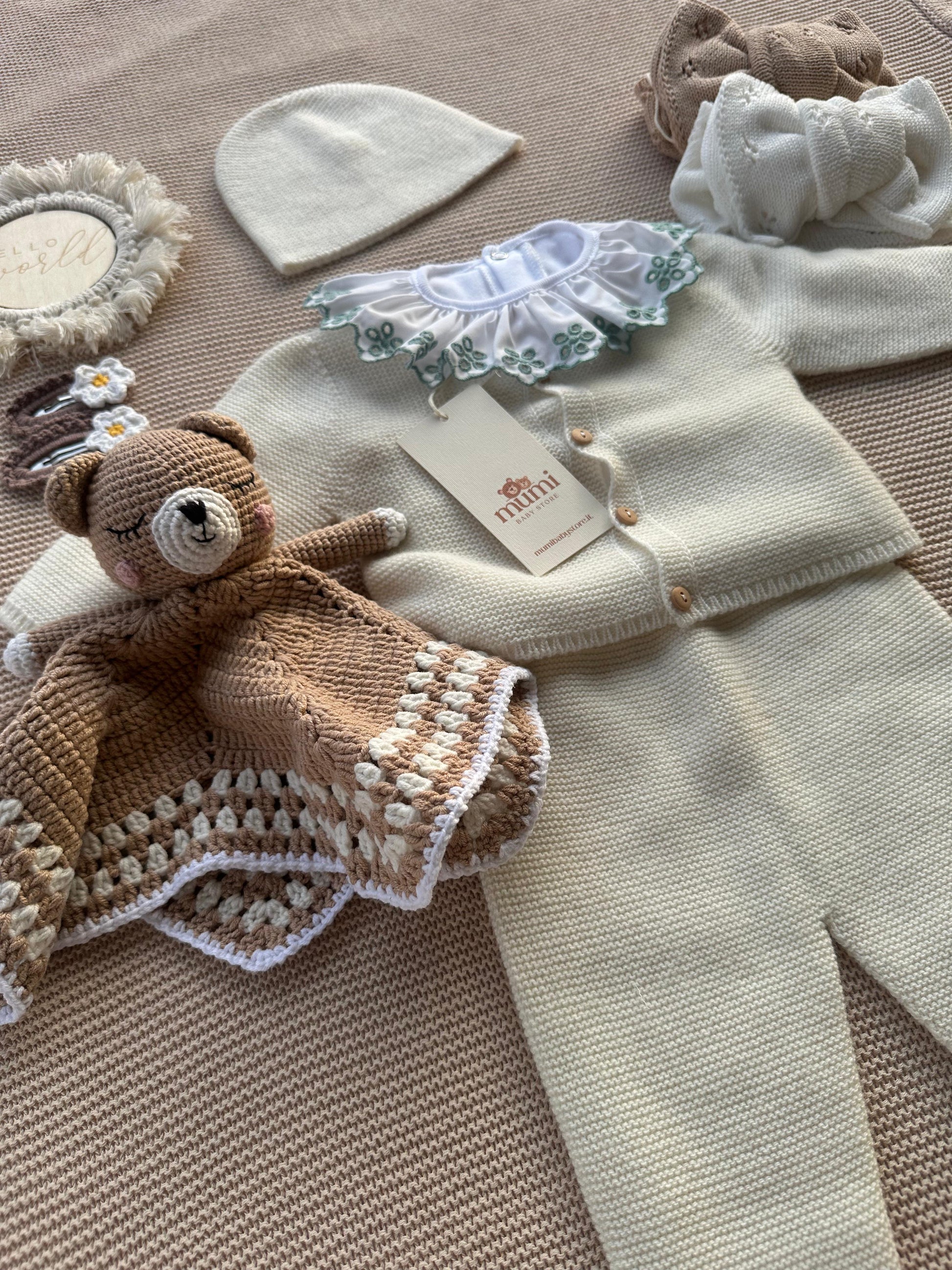 Avvolgi il tuo piccolo nella morbidezza del caldissimo set 3 pezzi pensato in lana e cashmere per coccolare il tuo bebè 🥰🧸, studiato per offrire calore, comfort e uno stile dolce e raffinato fin dai primi giorni ❄.