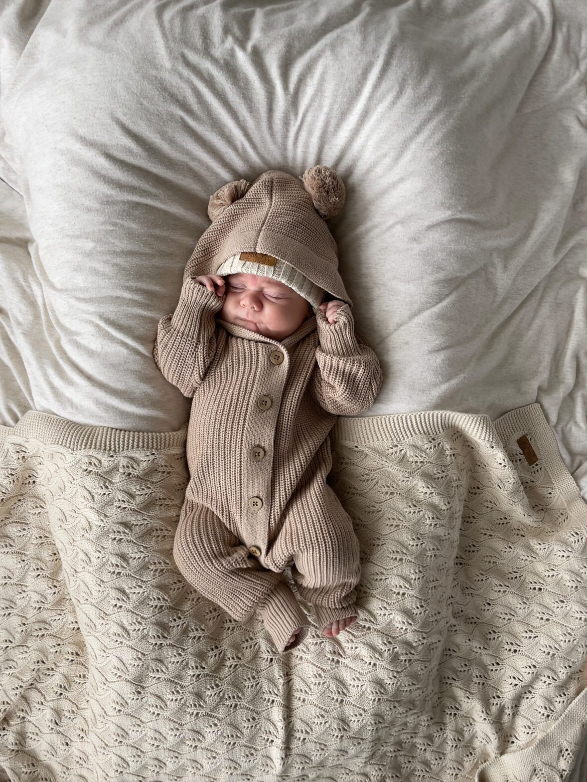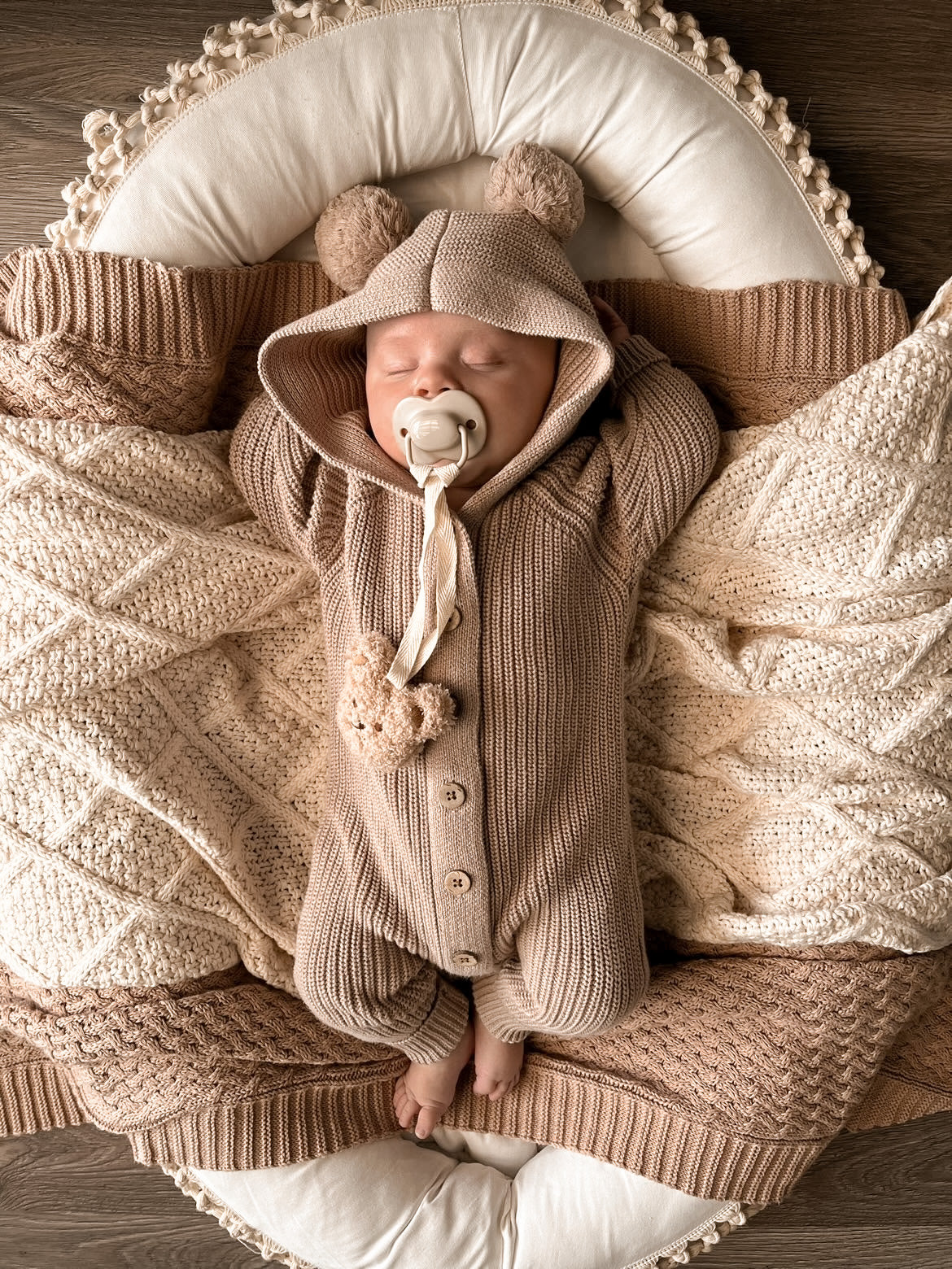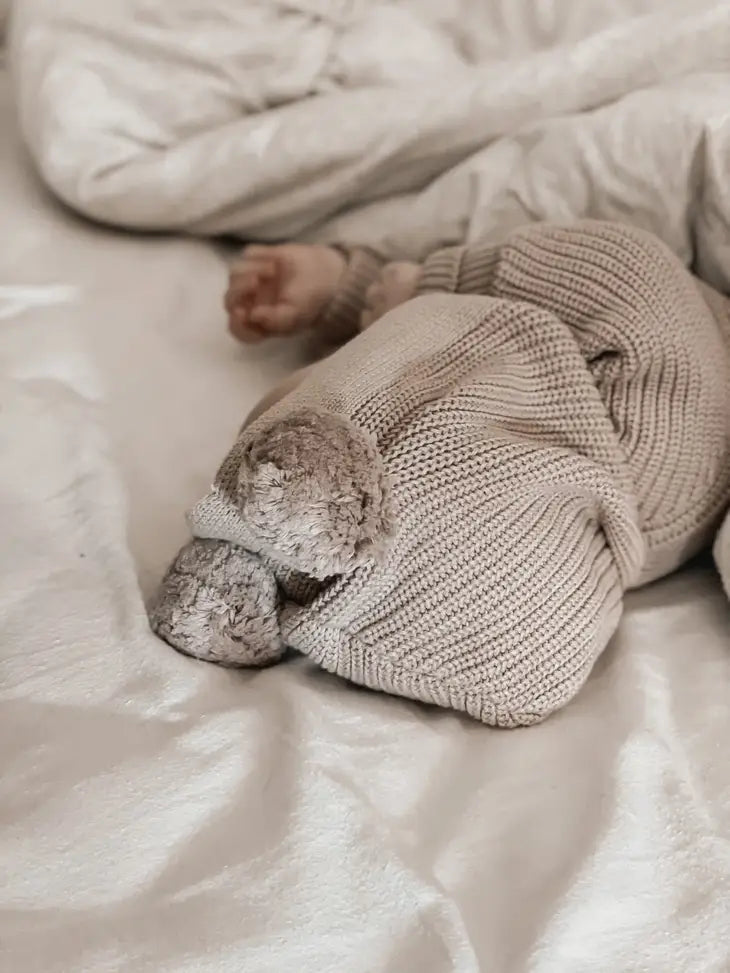 Tutina lavorata a maglia con cappuccio .Caratterizzato da bottoni vintage in legno con polsi e caviglie con risvolto, cappuccio con pompon lavorati a maglia ideale per l'autunno l'inverno e la primavera.